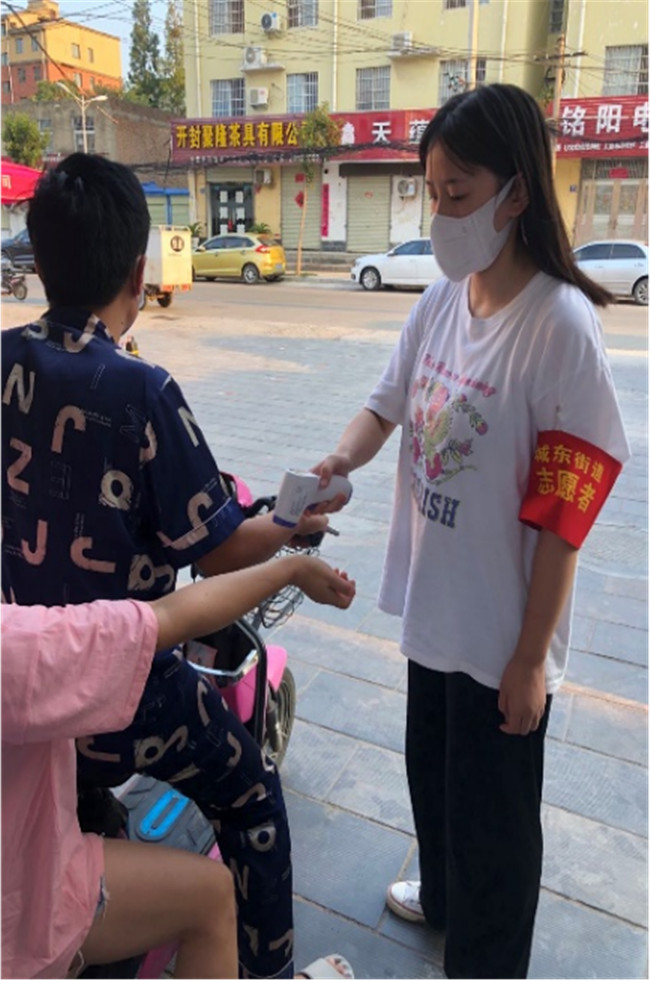 在進(jìn)行了規(guī)范的志愿服務(wù)培訓(xùn)后,張?chǎng)斡耆缭讣尤胍咔榉揽毓ぷ麝?duì)伍。她了解到開(kāi)封市城東街道管轄人員一百多人,要排查祥符區(qū)幾十萬(wàn)人口,任務(wù)艱巨,同樣也很神圣。她帶著使命感加入這次防控疫情大家庭中,一方面把業(yè)主卡發(fā)放到位,量測(cè)居民體溫,戶主填寫(xiě)信息以及簽訂疫情防控承諾書(shū),查驗(yàn)行程碼和健康碼,發(fā)現(xiàn)碼異常人員及時(shí)溝通。另一方面,協(xié)助城東街道辦事處,組織群眾做核酸檢測(cè),維持隊(duì)伍秩序,保持距離提醒,防疫知識(shí)宣傳。