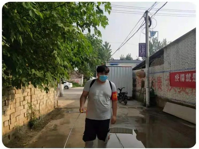 剛剛挨家挨戶統(tǒng)計(jì)完外來(lái)人員信息,汗水未干,汽車與航空工程學(xué)院新能源汽車技術(shù)1903班張浩又背起消殺器材對(duì)自己所在的濮陽(yáng)縣清河頭鄉(xiāng)東大韓村的各個(gè)角落,進(jìn)全面行消殺,尤其是村里廣場(chǎng)、健身器材、菜市場(chǎng)等位置進(jìn)行了重點(diǎn)消殺,不放過(guò)任何一個(gè)地方,不留一個(gè)死角,確保村莊能夠安全防控新冠肺炎病毒和其他病毒細(xì)菌的侵害,他用噴霧器為居民和病毒之間撐起了一把保護(hù)傘,為家鄉(xiāng)平安吹起沖鋒號(hào)。