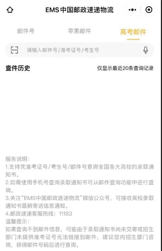 通知書狀態(tài)簡單可查,利用微信查詢:進(jìn)入微信公眾號,并關(guān)注:中國郵政速遞物流,公眾號關(guān)注后,輸入“準(zhǔn)考證號碼”或“手機(jī)號碼”進(jìn)行查詢