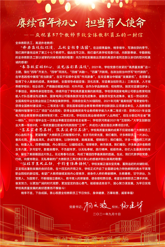 今年教師節(jié),鄭州電專(zhuān)慶祝活動(dòng)以“賡續(xù)百年初心,擔(dān)當(dāng)育人使命”為主題,求真務(wù)實(shí)、勤儉節(jié)約、隆重簡(jiǎn)樸地開(kāi)展教師節(jié)各項(xiàng)活動(dòng),展現(xiàn)全校教師隊(duì)伍良好精神風(fēng)貌,營(yíng)造尊師重教的良好校園氛圍。