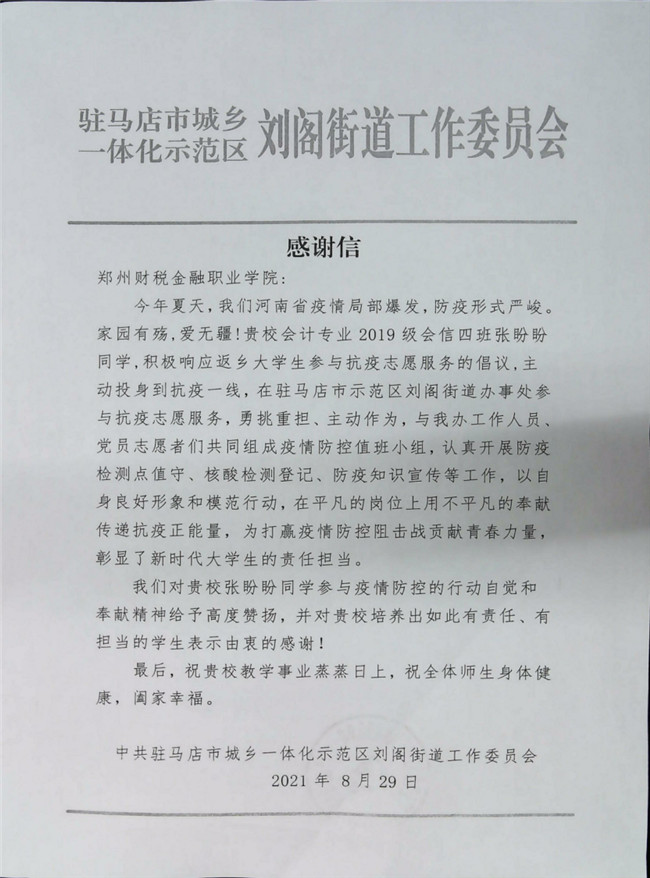 8月29日,中共駐馬店市城鄉(xiāng)一體化示范區(qū)劉閣街道工作委員會(huì)向該院發(fā)來(lái)感謝信,誠(chéng)摯感謝19級(jí)會(huì)計(jì)信息管理4班張盼盼同學(xué)在疫情發(fā)生的第一時(shí)間投入到大學(xué)生志愿服務(wù)行動(dòng)中,勇于擔(dān)當(dāng)、主動(dòng)作為,在平凡的崗位上用不平凡的奉獻(xiàn)傳遞正能量。