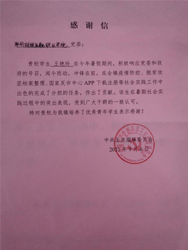 9月6日,中共鹿邑縣王皮溜鎮(zhèn)委員會(huì)向該院發(fā)來(lái)感謝信,誠(chéng)摯感謝會(huì)計(jì)學(xué)院19級(jí)財(cái)務(wù)管理4班王艷玲同學(xué)在暑假期間在全鎮(zhèn)疫情防控、脫貧攻堅(jiān)、國(guó)家反詐中心APP下載注冊(cè)等工作中做出的突出貢獻(xiàn)。
