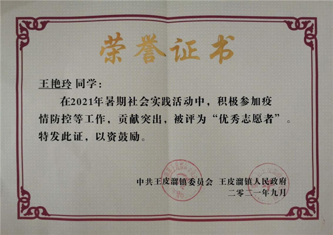 王艷玲同學(xué)在志愿服務(wù)工作期間,開展返鄉(xiāng)人員信息登記、收取核酸檢測(cè)報(bào)告以及宣傳疫情防控相關(guān)知識(shí)等工作。同時(shí),為了響應(yīng)國(guó)家號(hào)召她組織每村每戶下載注冊(cè)“國(guó)家反詐中心”APP,得到了鎮(zhèn)書記和值班領(lǐng)導(dǎo)的一致好評(píng),并被中共鹿邑縣王皮溜鎮(zhèn)委員會(huì) 王皮溜鎮(zhèn)人民政府評(píng)為“優(yōu)秀志愿者”。