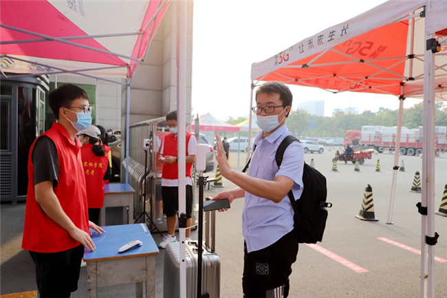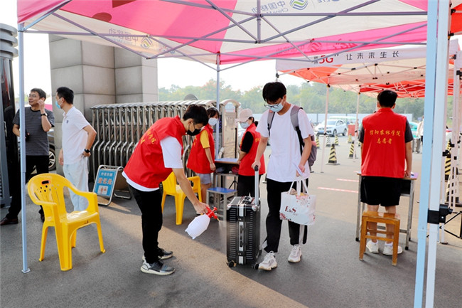 為迎接第一批學生安全有序返校,信陽農(nóng)林學院安排志愿者在南大門核驗返校學生身份、健康碼、行程碼、核酸檢測證明,并進行體溫檢測、行李消殺等入校程序;學校租用校內(nèi)擺渡車,免費幫學生托運行李。從學校大門交通指引、人工通道,到校內(nèi)擺渡車接駁點、宿舍接待處,各部門工作人員、志愿者們都堅守在各自的工作崗位上,各項工作開展井然有序。