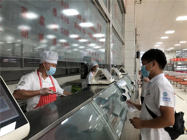 在餐廳北門(mén)口設(shè)置測(cè)溫點(diǎn),安排專(zhuān)人負(fù)責(zé)維持餐廳秩序。學(xué)生經(jīng)洗手、測(cè)溫、消毒后有序從第一餐廳北門(mén)進(jìn)入,進(jìn)入餐廳后學(xué)生按地面標(biāo)識(shí)線,沿同一方向順序移動(dòng),購(gòu)買(mǎi)餐食后有序從東門(mén)出餐廳。