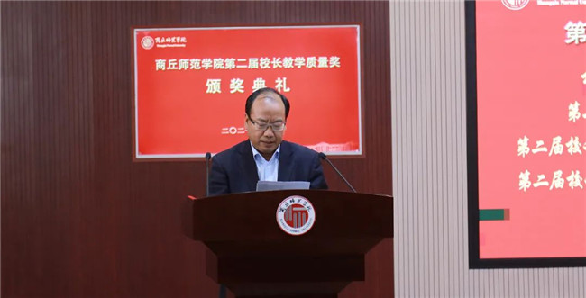 郭文佳宣讀《商丘師范學(xué)院關(guān)于表彰第二屆校長(zhǎng)教學(xué)質(zhì)量獎(jiǎng)獲獎(jiǎng)?wù)叩臎Q定》。