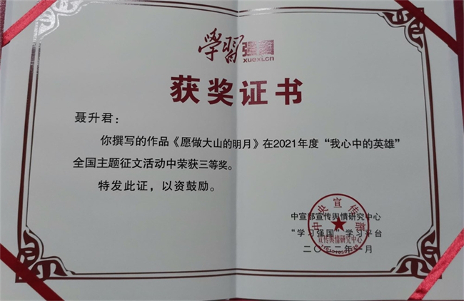 中新河南網(wǎng)1月25日電 近日,“學(xué)習(xí)強國”學(xué)習(xí)平臺舉辦的“我心中的英雄”主題征文活動獲獎名單公布,濮陽職業(yè)技術(shù)學(xué)院體育健康學(xué)院2019級學(xué)生聶升君的作品《愿做大山的明月》獲三等獎。