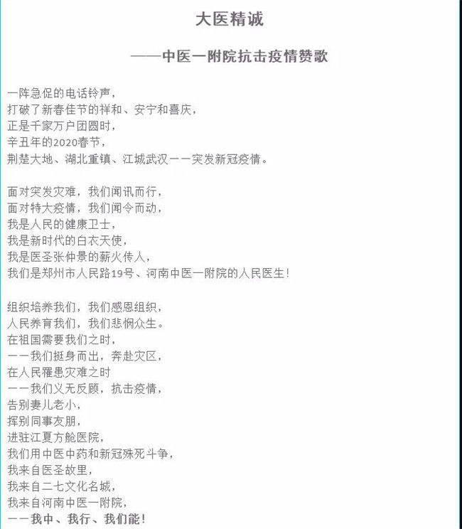 近日,多位藝術(shù)界友人有感于近年來一附院醫(yī)務(wù)工作者為疫情防控工作做出的突出貢獻(xiàn),圍繞一附院抗疫事跡,聯(lián)合創(chuàng)作并錄制了詩詞朗誦作品——《大醫(yī)精誠:中醫(yī)一附院抗擊疫情贊歌》,以表達(dá)對戰(zhàn)疫一線最美逆行者們的致敬之情,該部作品于2022年1月23日,在“河南朗誦”公眾號平臺發(fā)布。