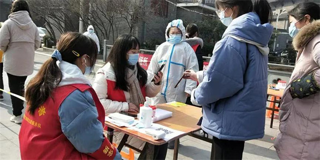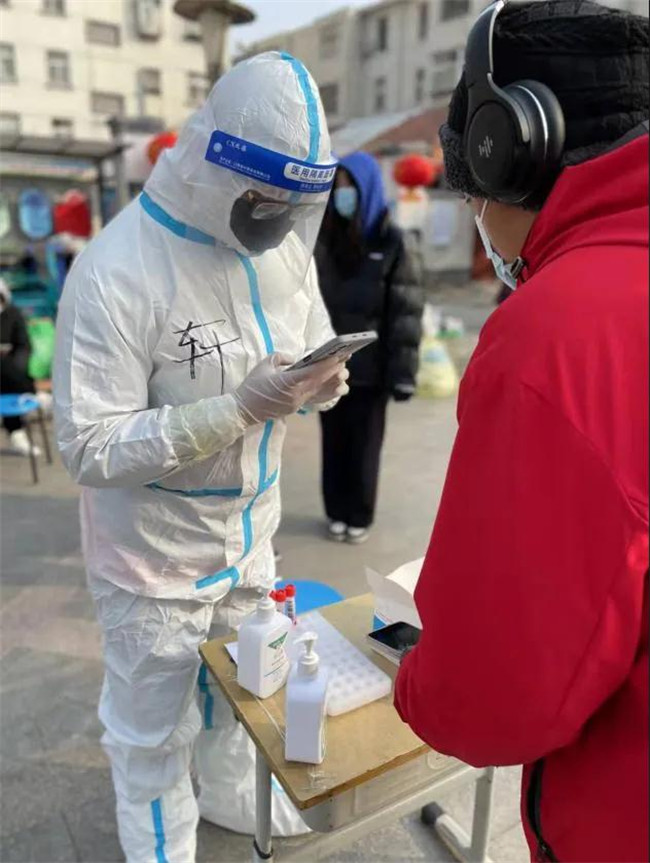 在連續(xù)七次全員核酸檢測試點(diǎn)項(xiàng)目中,為居民建立快速掃碼通道;為了不影響白天正常的全員核酸進(jìn)程,凌晨四點(diǎn)開始準(zhǔn)備防護(hù)物品,為從通訊新天地、銀基等高風(fēng)險(xiǎn)地區(qū)返回的密接、次密接居家隔離人員上門做檢測。凌晨的風(fēng),冰冷刺骨,常常手指僵硬不聽使喚;凌晨的地面,在白雪的覆蓋下異常光滑,每一步都充滿危險(xiǎn);身穿防護(hù)服在狹窄的樓道中來回穿梭,身形尤為笨拙。