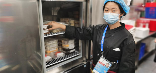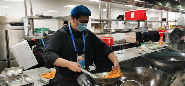 為保證技術(shù)官員和志愿者每天吃到可口的美味,糖醋里脊、紅燒肉、雞里蹦、炸魚排、耗油扒菜膽、五彩素繪......一道道美食每天輪番登場,這些美食的背后離不開烹飪工藝與營養(yǎng)專業(yè)學生的辛苦付出。他們每天迎著晨曦出發(fā),在后廚進行著緊張而有序的工作,披星戴月而歸結(jié)束一天的奮戰(zhàn),為保證每天的花樣美食付出著艱辛的勞動。