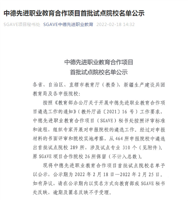 此次試點院校遴選工作,是在對申報材料的書面評審和實地考察的基礎(chǔ)上、從參選的464所院校中遴選出289所,教育部國際合作與交流司、職業(yè)教育與成人教育司委托中德先進職業(yè)教育合作項目秘書處組織開展。旨在借鑒德國等歐洲國家行業(yè)龍頭企業(yè)開展“雙元制”人才培養(yǎng)的技術(shù)和經(jīng)驗儲備,按照“雙元制”模式要求中德聯(lián)合開發(fā)和實施適應(yīng)我國國情的技術(shù)技能人才培養(yǎng)方案。通過課程體系建設(shè)、“雙師型”教師隊伍培養(yǎng)、考核和評估認(rèn)證體系構(gòu)建等多種方式,推動“三教”改革,提升職業(yè)院校產(chǎn)教融合、校企合作與國際交流水平,打造高素質(zhì)技術(shù)技能人才培養(yǎng)國際合作精品項目,為我國制造業(yè)轉(zhuǎn)型升級和高質(zhì)量發(fā)展奠定人才基礎(chǔ)。