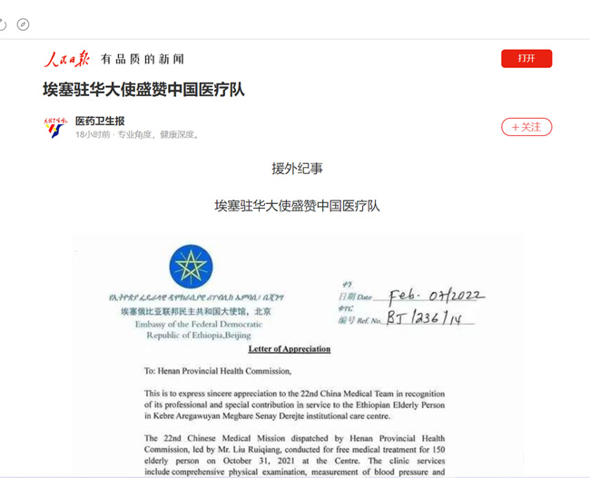 2月11日,人民日報人民號發(fā)布援外記事——埃塞駐華大使盛贊中國醫(yī)療隊。受表揚的中國援埃塞俄比亞第22批醫(yī)療隊16名隊員中包括該校外語學(xué)院何陽教授和三附院林國平副主任醫(yī)師2名優(yōu)秀隊員。