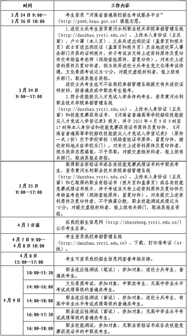 符合上述技能拔尖人才免試入學(xué)條件的考生,須于2022年3月24日9時至17時,登錄黃河水利職業(yè)技術(shù)學(xué)院單招管理系統(tǒng)(http://danzhao.yrcti.edu.cn),上傳本人身份證(正反面)和技能競賽獲獎證書、《河南省普通高等學(xué)校招收技能拔尖人才免試入學(xué)登記表》照片,并于2022年4月9日9時至17時將本人身份證和技能競賽獲獎證書原件及復(fù)印件、《河南省普通高等學(xué)校招收技能拔尖人才免試入學(xué)登記表》(原件一式3份)交予學(xué)校審核(現(xiàn)場查驗證書原件,留復(fù)印件,接收材料地點在學(xué)校東門)。對未交上述資料原件及復(fù)印件者,視為放棄志愿填報,不予錄取;對提交虛假材料者,報上級有關(guān)部門,取消其報名資格。