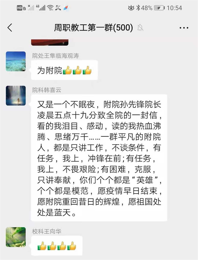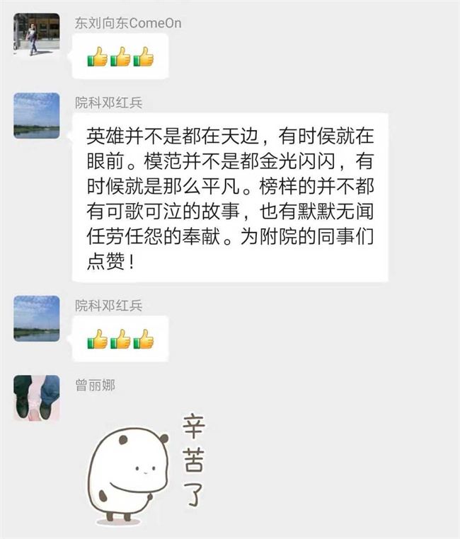 “又是一個不眠夜,附院孫先鋒院長凌晨5點19分的這封信,看得我淚目、感動,讀得我熱血沸騰、思緒萬千。”同事韓喜云說。“讀得熱淚盈眶,你們辛苦了!”同事劉炎說。“英雄并不都在天邊,有時候就在眼前,為附院的同事們點贊。”同事鄧紅兵說。