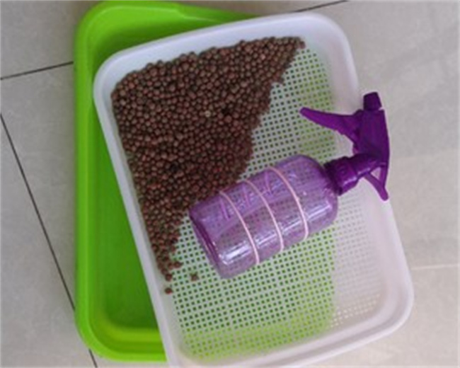 (2)24小時(shí)之后,把豆種撈出放在上層育苗盤里,用紙巾蓋住,一般家里的抽紙,卷紙都行,把盤放在陰涼處,不能曬太陽,用噴壺每天朝紙上噴水3-5次,把紙巾噴潮即可,不用太多!下層育苗盤里不能放水!一般兩天左右,你就會(huì)發(fā)現(xiàn)長出類似白色的根!不用管它,繼續(xù)噴兩天!
