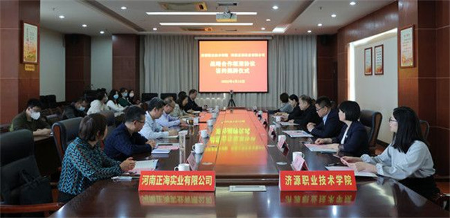 濟(jì)源職業(yè)技術(shù)學(xué)院院長李國鋒代表學(xué)院致辭,就學(xué)院的基本情況、辦學(xué)特色、辦學(xué)成果等方面做了介紹。他指出校企合作是貫徹落實(shí)職業(yè)教育服務(wù)重點(diǎn)項(xiàng)目建設(shè)的重要步驟,是學(xué)院推進(jìn)辦學(xué)模式和人才培養(yǎng)模式改革、增強(qiáng)為地方經(jīng)濟(jì)建設(shè)服務(wù)能力的有效途徑,也是新時(shí)代推動(dòng)學(xué)校人才培養(yǎng)供給側(cè)與產(chǎn)業(yè)需求側(cè)緊密對接的迫切需要。這次簽約儀式,標(biāo)志著學(xué)院與正海實(shí)業(yè)有限公司在深化合作方面邁出了堅(jiān)實(shí)的一步。希望雙方能夠以此為契機(jī),加強(qiáng)科學(xué)研究、專業(yè)規(guī)劃、人才培養(yǎng)、學(xué)術(shù)交流、教學(xué)實(shí)訓(xùn)等方面的深度合作,促進(jìn)教育鏈、人才鏈、產(chǎn)業(yè)鏈、創(chuàng)新鏈“四鏈”有機(jī)銜接,推進(jìn)產(chǎn)業(yè)、行業(yè)、企業(yè)、職業(yè)、專業(yè)“五業(yè)”良性互動(dòng),為濟(jì)源重點(diǎn)項(xiàng)目建設(shè)共同培育高素質(zhì)創(chuàng)新人才和技術(shù)技能人才,合力打造濟(jì)源產(chǎn)教融合示范區(qū)、校地合作新樣板。