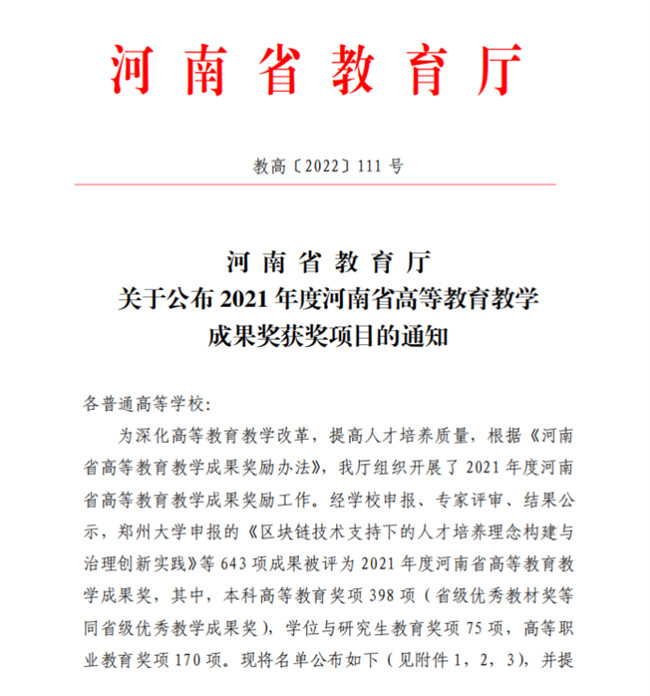 中新河南網(wǎng)4月25日電(趙悅?cè)?龍芃君) 近日,河南省教育廳下發(fā)了《關(guān)于公布2021年度河南省高等教育教學(xué)成果獎獲獎項目的通知》(教高〔2022〕111號),鄭州升達(dá)經(jīng)貿(mào)管理學(xué)院郭愛先的《民辦高校以應(yīng)用轉(zhuǎn)型推進(jìn)高質(zhì)量發(fā)展的研究與實踐》、沈定軍的《新時代“立德樹人”融入高校就業(yè)創(chuàng)新創(chuàng)業(yè)教育教學(xué)的改革研究與實踐》獲河南省高等教育教學(xué)成果一等獎。