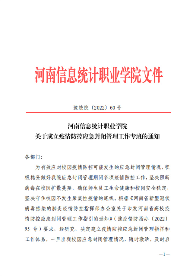 加強(qiáng)組織領(lǐng)導(dǎo),落實(shí)落細(xì)有力度。為充分發(fā)揮黨的領(lǐng)導(dǎo)在疫情防控工作中的最大優(yōu)勢(shì),河南信息統(tǒng)計(jì)職業(yè)學(xué)院黨委成立由黨委書(shū)記、院長(zhǎng)擔(dān)任組長(zhǎng)的疫情防控應(yīng)急封閉管理工作專(zhuān)班。專(zhuān)班下設(shè)9個(gè)應(yīng)急處置專(zhuān)項(xiàng)工作組。為切實(shí)提高應(yīng)急處置工作時(shí)效性和針對(duì)性,河南信息統(tǒng)計(jì)職業(yè)學(xué)院在金水和白沙校區(qū)分別設(shè)置疫情防控指揮小組,學(xué)院領(lǐng)導(dǎo)分組負(fù)責(zé)校區(qū)防控工作,及時(shí)分析形勢(shì)、研判情況,因地制宜精準(zhǔn)調(diào)度疫情應(yīng)對(duì)處置工作,確保防疫和服務(wù)措施落細(xì)落實(shí)。