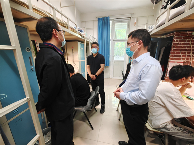 在學(xué)生公寓,學(xué)校領(lǐng)導(dǎo)查看了學(xué)生宿舍門禁系統(tǒng)、線上教學(xué)等情況,看望慰問部分學(xué)生,叮囑他們要嚴(yán)格遵守學(xué)校防疫規(guī)定,爭(zhēng)取共同早日戰(zhàn)勝疫情,并勉勵(lì)同學(xué)們努力學(xué)習(xí)知識(shí),積極進(jìn)取報(bào)效國(guó)家。