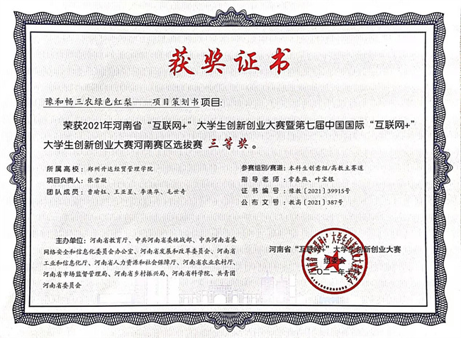 2021年7月21日至22日,“建行杯”2021年河南省“互聯(lián)網(wǎng)+”大學(xué)生創(chuàng)新創(chuàng)業(yè)大賽暨第七屆中國(guó)“互聯(lián)網(wǎng)+”大學(xué)生創(chuàng)新創(chuàng)業(yè)大賽選拔賽在河南師范大學(xué)舉行。經(jīng)過(guò)前期省內(nèi)各高校的層層選拔,商學(xué)院電子商務(wù)專(zhuān)業(yè)學(xué)生團(tuán)隊(duì)報(bào)送的“豫和暢三農(nóng)綠色紅梨”項(xiàng)目獲得省賽三等獎(jiǎng)。