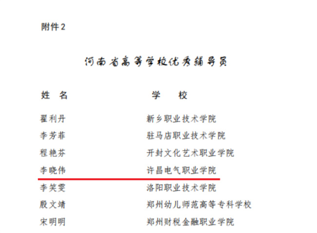 許昌電氣職業(yè)學院輔導員李曉偉獲評省級“優(yōu)秀輔導員”