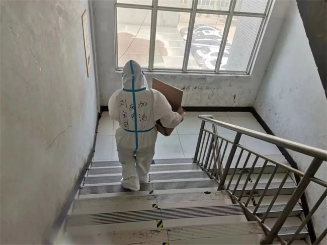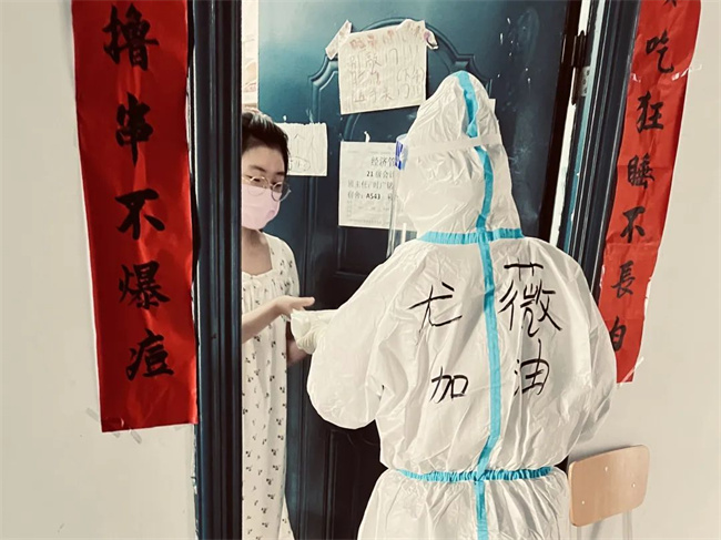 劉欣負(fù)責(zé)A棟宿舍樓值班和分餐任務(wù),為了給生病的學(xué)生送藥,匆忙趕路時(shí)不慎摔倒,她來(lái)不及處理傷口,第一時(shí)間把藥送到學(xué)生手中。介科懿負(fù)責(zé)一天兩次核酸檢測(cè),每天走的最早、回來(lái)的最晚。原本講壇上端莊優(yōu)雅的女教師,化身抗疫女戰(zhàn)士,在彼此的眼神中,她們看到了會(huì)心一笑的默契。原來(lái),這不美的樣子真颯!
