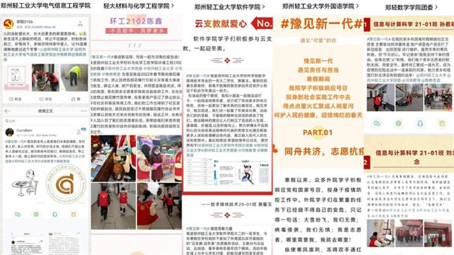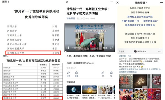 自活動開展以來,學校積極響應落實上級工作部署,全校各級團組織全面動員、積極配合,主動利用微信公眾號、微博等新媒體矩陣進行廣泛宣傳,進一步深化育人與實踐融合、線上與線下呼應的網絡思政工作機制。本次活動以紅色文化育人、社會實踐育人等方式,通過騰訊微博積極參與#豫見新一代#話題討論,引導青年學生緊緊圍繞時代發(fā)展,進一步學習黨的故事、革命的故事、英雄的故事,感受黨的百年奮斗初心使命和人民群眾幸福生活;顒娱_展期間,近萬名輕工大青年學子在做好自身防護的同時,圍繞“關愛老年人”“關愛青少年”“疫情防控”“迎春節(jié)·弘揚傳統(tǒng)文化”“運動技能打卡”“四史學習”等主題教育實踐活動,以“記錄分享身邊人身邊事”的形式,正確認識、主動宣傳、嚴格服從和積極服務于防疫抗疫大局,傳承革命精神、孝老敬親扶幼、弘揚傳統(tǒng)文化、涵養(yǎng)家國情懷,共發(fā)表微博1萬余篇,累計閱讀量達到20萬余次。其中,國際教育學院學生鄭鵬飛的疫情防控先進事跡和政法學院學生孫業(yè)凈、曹昕欣、馬景娜的春節(jié)年俗趣味故事被河南省教育廳微信公眾號“豫教思語”轉載報道。