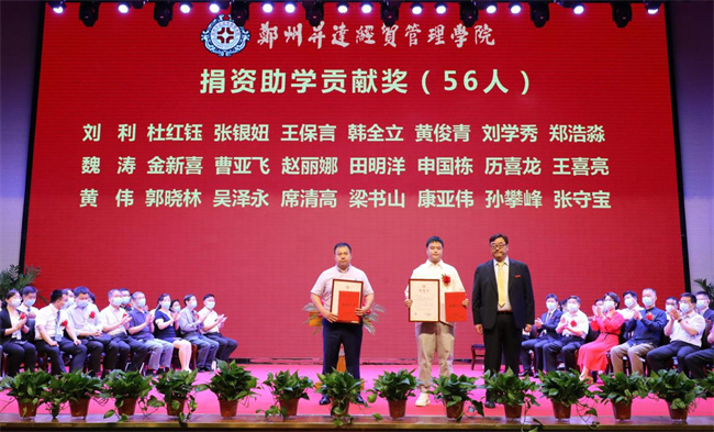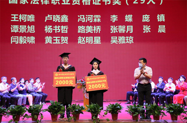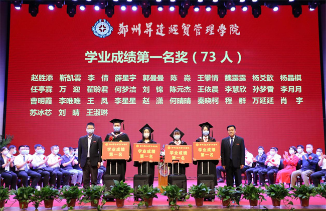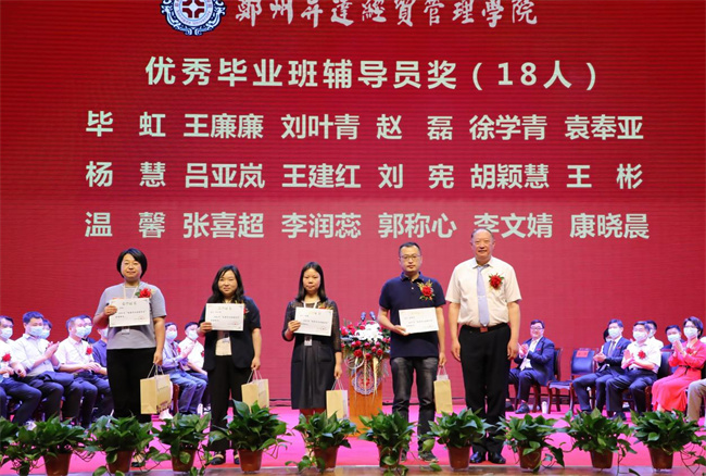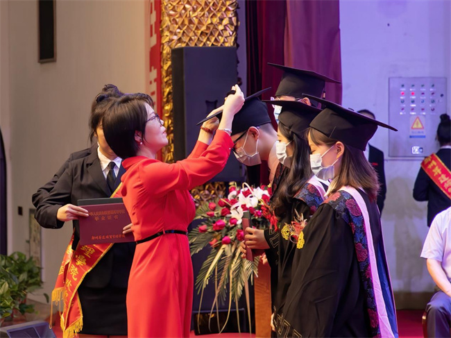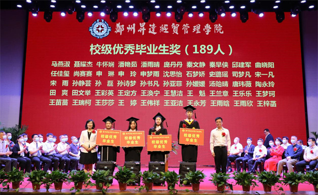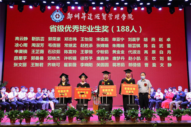 吳益民宣讀了《鄭州升達(dá)經(jīng)貿(mào)管理學(xué)院學(xué)位委員會(huì)關(guān)于授予2022屆普通本科畢業(yè)生學(xué)士學(xué)位的決定》和《鄭州升達(dá)經(jīng)貿(mào)管理學(xué)院關(guān)于表彰710名2022屆畢業(yè)生的決定》。校長(zhǎng)張欣為畢業(yè)生代表頒發(fā)畢業(yè)證書、學(xué)士學(xué)位證書并扶正流蘇。嘉賓、校領(lǐng)導(dǎo)為學(xué)業(yè)成績(jī)第一名代表,省、校級(jí)優(yōu)秀畢業(yè)生和考取各類證照的優(yōu)秀畢業(yè)生代表,資深榮譽(yù)教授,優(yōu)秀畢業(yè)班輔導(dǎo)員,捐資助學(xué)貢獻(xiàn)獎(jiǎng)代表等頒獎(jiǎng)。