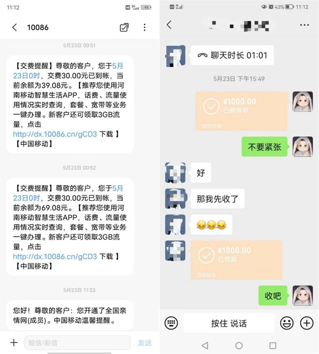 第二天張師傅發(fā)現(xiàn)后,覺得孩子這一趟回來真不容易,給小張充了60元話費(fèi)。
