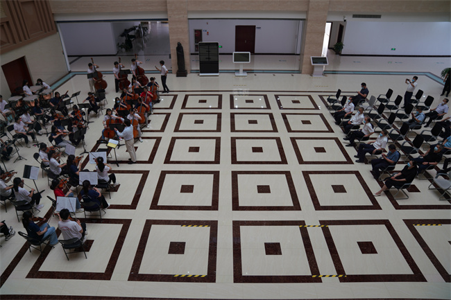 在圖文中心二樓大廳,音樂學(xué)院交響樂團(tuán)現(xiàn)場奏響了《我的祖國》。“一條大河波浪寬,風(fēng)吹稻花香兩岸……”當(dāng)樂手們演奏起這段熟悉的旋律,臺下聽眾不禁輕聲哼唱起來,愛國之情在心中久久回蕩。