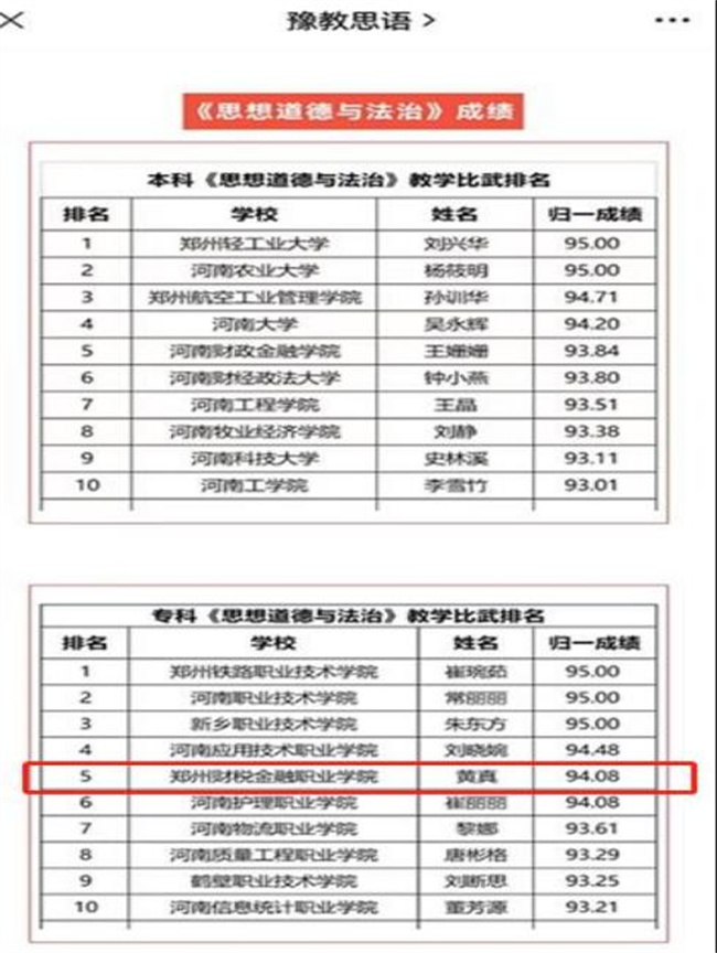 該院從2022年3月以來就認(rèn)真落實(shí)河南省委教育工委、河南省教育廳《關(guān)于開展全省學(xué)校思想政治理論課教學(xué)技能“大練兵、大比武、大展示”活動(dòng)的實(shí)施意見》要求,向?qū)W院黨委匯報(bào)實(shí)施方案,黨委書記王霄鸝和院長程慎多次到一線課堂、練兵現(xiàn)場指導(dǎo)備賽,參賽選手認(rèn)真準(zhǔn)備,采用多種形式打磨思政“金”課,歷經(jīng)初賽和復(fù)賽兩次選拔,黃真和普淑玲兩位教師進(jìn)入全省“大比武”環(huán)節(jié)。