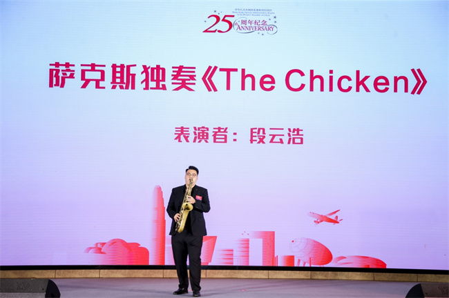 19日晚,香港特區(qū)政府行政長(zhǎng)官李家超在慶祝晚宴上視頻致辭,河南省人民政府副秘書(shū)長(zhǎng)黃東升講話,香港特區(qū)駐河南聯(lián)絡(luò)處主任劉錦泉致辭。期間文藝演出環(huán)節(jié),學(xué)校藝術(shù)學(xué)院2022屆優(yōu)秀畢業(yè)生段云浩為大家表演薩克斯獨(dú)奏《The Chicken》,精彩的演奏充分展現(xiàn)了該校學(xué)子的專業(yè)水準(zhǔn),贏得了與會(huì)嘉賓的陣陣掌聲。