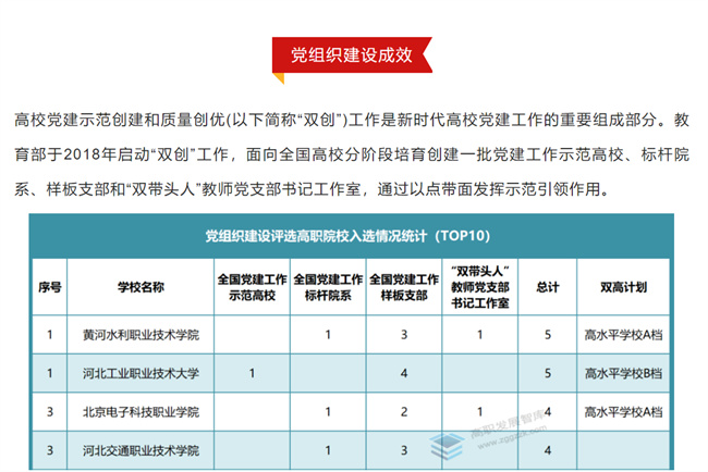 高校基層黨組織是黨在高校全部工作和戰(zhàn)斗力的基礎(chǔ),擔(dān)負(fù)著將黨的路線方針政策落實(shí)到高;鶎拥闹匾氊(zé)。加強(qiáng)高職院校黨的建設(shè)尤其是基層黨建,是高等學(xué)校堅(jiān)持正確辦學(xué)方向、落實(shí)立德樹人根本任務(wù)、助推“雙高計(jì)劃”建設(shè)的根本保證。近年來(lái),校黨委認(rèn)真貫徹新時(shí)代黨的建設(shè)總要求和新時(shí)代黨的組織路線,圍繞立德樹人根本任務(wù),聚焦黨建工作提質(zhì)增效,以黨建“雙創(chuàng)”工作為抓手,以質(zhì)量特色為根本,以改革創(chuàng)新為動(dòng)力,通過(guò)實(shí)施“兩化一創(chuàng)”強(qiáng)基引領(lǐng)三年行動(dòng)計(jì)劃,推行“十聚焦十提升”基層黨建工作法,構(gòu)建完善了國(guó)家、省、校三級(jí)培育體系;通過(guò)選樹培育黨建工作典型,以點(diǎn)帶面發(fā)揮示范引領(lǐng)作用,增強(qiáng)黨建品牌效應(yīng),進(jìn)一步提升基層黨組織的組織力、戰(zhàn)斗力和凝聚力。按照“抓點(diǎn)帶面、連點(diǎn)串線、示范帶動(dòng)、整體推進(jìn)”的工作思路,打造了一批“樣板支部”“標(biāo)桿院系”等基層黨建工作示范點(diǎn),培育創(chuàng)建了全國(guó)黨建工作標(biāo)桿院系1個(gè)、樣板支部3個(gè),省級(jí)樣板支部4個(gè),校級(jí)標(biāo)桿院系12個(gè)、樣板支部33個(gè),校級(jí)特色品牌項(xiàng)目22項(xiàng),充分發(fā)揮了典型示范引領(lǐng)、輻射帶動(dòng)作用,形成了黨建和業(yè)務(wù)工作融合發(fā)展的良好局面。(黃河水利職業(yè)技術(shù)學(xué)院供稿)