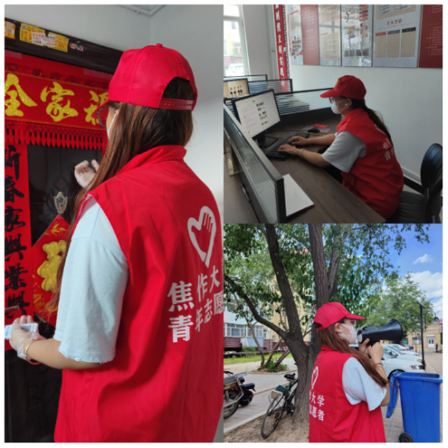 信息工程學(xué)院21級(jí)軟件技術(shù)一班張斯諾返鄉(xiāng)后第一時(shí)間投入到內(nèi)蒙古赤峰市元寶山區(qū)平莊鎮(zhèn)的疫情防控工作中,按照疫情防控常態(tài)化的要求,用實(shí)際行動(dòng)為打贏疫情防控阻擊戰(zhàn)貢獻(xiàn)志愿力量。作為一名青年志愿者,她始終把志愿者精神牢記在心,在志愿活動(dòng)中認(rèn)真負(fù)責(zé),盡力服務(wù),向社會(huì)展現(xiàn)出焦作大學(xué)青年志愿者的風(fēng)采。“此次社會(huì)實(shí)踐活動(dòng)讓我感觸很多,真正理解了‘從群眾中來,到群眾中去’的內(nèi)在涵義,認(rèn)識(shí)到只有把個(gè)人的命運(yùn)同社會(huì)、同國(guó)家的命運(yùn)聯(lián)系起來,才是青年成長(zhǎng)的正確之路。”她說道。
