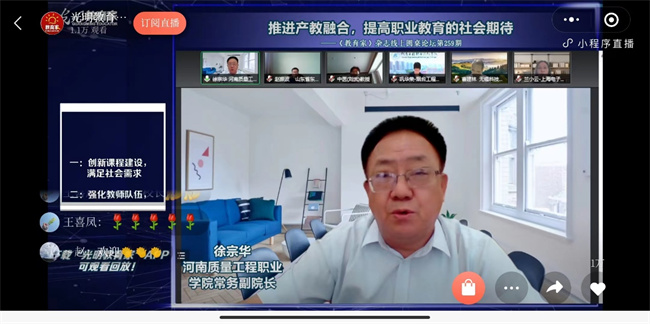 近日,河南質(zhì)量工程職業(yè)學院常務副院長徐宗華受光明日報《教育家》雜志編輯部的邀請,參加了《教育家》雜志線上圓桌論壇,論壇主題為“推進產(chǎn)教融合,提高職業(yè)教育的社會期待”。本次圓桌論壇共邀請廣西中醫(yī)藥大學、上海電子信息職業(yè)技術學院等全國各地職業(yè)院校的6名專家圍繞“創(chuàng)新課程建設,滿足社會需求”“強化教師隊伍,持續(xù)提高教育質(zhì)量”“完善融合機制,建構良性生態(tài)”三項議題進行了深入探討。