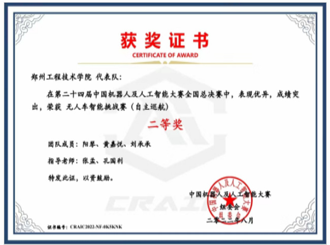 中新河南網(wǎng)8月22日電 近日,第二十四屆中國機(jī)器人及人工智能大賽全國總決賽獲獎名單出爐,鄭州工程技術(shù)學(xué)信息工程學(xué)院物聯(lián)網(wǎng)工程系師生再獲佳績,物聯(lián)網(wǎng)工程系學(xué)生陽琴、黃嘉悅、劉承承獲無人車智能挑戰(zhàn)賽國家二等獎,于自豪、高偉杰、李贊、趙曦、黃瑩、袁奕凡等同學(xué)獲無人車智能挑戰(zhàn)賽優(yōu)秀獎。