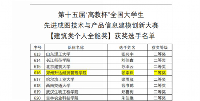 中新河南網(wǎng)8月24日電(曹萌萌) 鄭州升達經(jīng)貿(mào)管理學院建工學院代表隊在第十五屆“高教杯”全國大學生先進成圖技術與產(chǎn)品信息建模創(chuàng)新大賽全國總決賽中六人居家參賽,其中張宗躍、付向榮、壽業(yè)達、陳磊、秦海萍榮獲建筑類團體三等獎;張宗躍榮獲個人全能二等獎,付向榮、 壽業(yè)達、陳磊、秦海萍榮獲個人全能三等獎。 BIM創(chuàng)新應用類張宗躍、付向榮、王亞帥、陳磊、秦海萍獲得建筑類團隊三等獎。