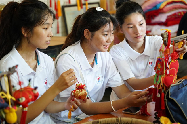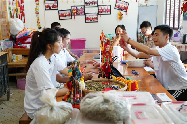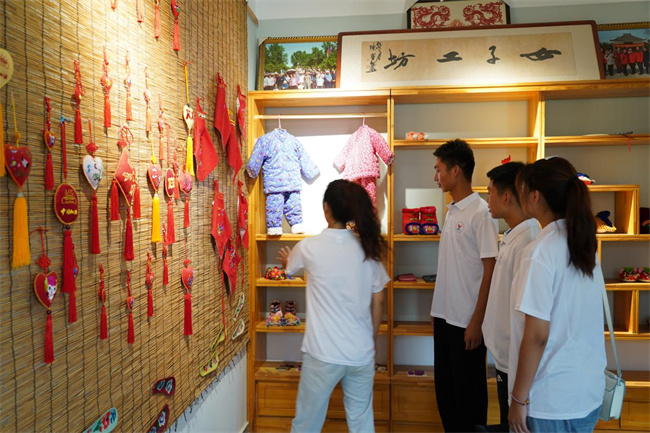 圖為實(shí)踐團(tuán)成員在女子工坊了解學(xué)習(xí)中草藥香包、虎頭鞋、剪紙等鄉(xiāng)村傳統(tǒng)民間非遺技藝項(xiàng)目和產(chǎn)品。王宛玲 攝