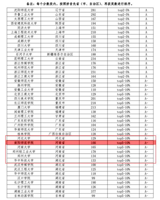 中新河南網9月8日電(杜志豪 師書魁) 日前,中國高等教育學會“高校競賽評估與管理體系研究”專家工作組對藝術類競賽指數進行分析發(fā)布。首輪藝術類競賽指數覆蓋的本科院校為1098所,南陽師范學院榮獲A-等級(綜合排名全國前5%-10%),在河南省高校中排名第一。