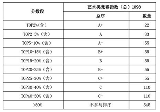 專家工作組以藝術類相關專業(yè)的普通高校為主要對象,采集了25項高校藝術類相關競賽近三年共1155683條競賽數據,首輪指數覆蓋了25項全國普通高校大學生藝術競賽,其中包含米蘭設計周等國內外重點賽事。從獲獎貢獻、參賽貢獻兩個維度構建了評估模型,研發(fā)了藝術類競賽指數,并劃分為A+、A、A-、B+、B、B-、C+、C、C-九個等級。