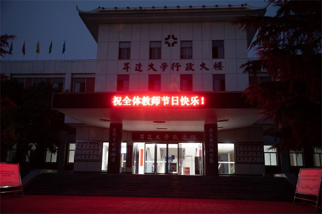 線下,9月8日至9月12日,學(xué)校在校內(nèi)行政樓、圖書館、體育館等多處標(biāo)志性建筑的電子顯示屏上,通過字幕滾動的方式深情道出“迎接黨的二十大,培根鑄魂育新人”“熱烈慶祝第38個教師節(jié)”“老師,您辛苦了!”“祝全體教師節(jié)日快樂!”“賡續(xù)百年初心,擔(dān)當(dāng)育人使命”“講臺能載千秋偉業(yè),燭光亦照萬里河山”等祝福語。這些熱忱的話語,既表達了對教師們的崇高敬意和真誠祝福,也給整個校園營造出一片濃厚的節(jié)日氛圍,引導(dǎo)學(xué)生感念師恩、禮敬老師。線上,從9月5日開始全校師生積極參與由中國教師發(fā)展基金會主辦的“感謝師恩 為教師亮燈”活動。師生們深情追憶求學(xué)路上老師們的諄諄教誨,感謝老師們的培育之恩,紛紛點亮感恩之光,為老師們送上真摯的祝福。