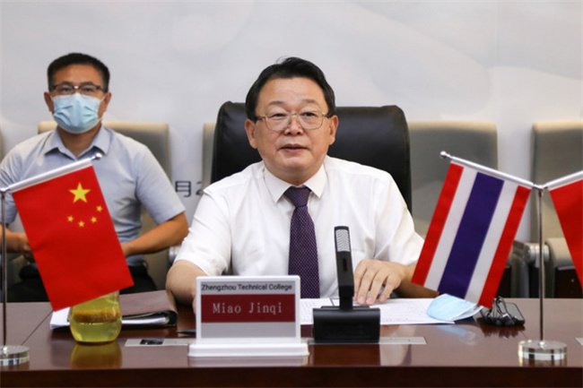 揭牌儀式上,黨委書記苗晉琦向參會嘉賓介紹了學;厩闆r及鄭州概況,并表示,學校與澈督蓬商業(yè)學院兩所學校在曼谷職業(yè)教育中心和唐風國際教育集團的支持下促成此次合作,從專業(yè)合作到課程開發(fā)等多領域協(xié)同發(fā)展,共同培養(yǎng)跨境電商專業(yè)人才,對服務中泰重大工程項目、提升中泰雙方對外教育合作水平具有重要意義。