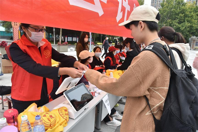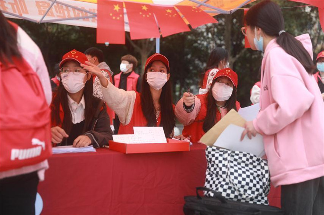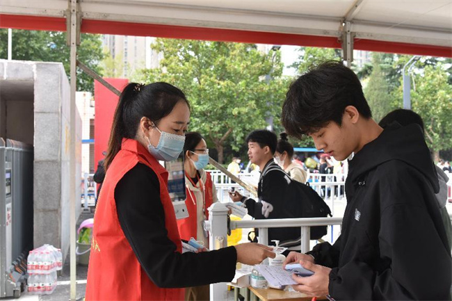志愿者引導(dǎo)新生測(cè)溫、檢查健康碼、核驗(yàn)身份信息、核酸檢測(cè)