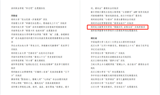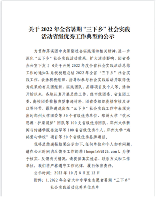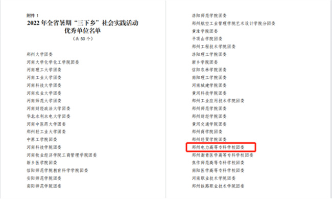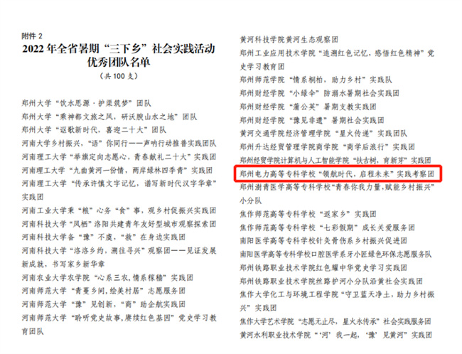 中新河南網10月21日電(李安杰) 近日,共青團中央對2022年全國大中專學生志愿者暑期文化科技衛(wèi)生“三下鄉(xiāng)”社會實踐活動中表現突出的優(yōu)秀集體和個人進行了通報表彰。經學校團委層層推報,“領航時代 啟程未來”實踐考察團(鄭州電力高等?茖W校電氣工程學院)榮獲2022年全國“三下鄉(xiāng)”社會實踐“優(yōu)秀團隊”榮譽稱號(全省共20個團隊入選,其中?圃盒H兩個),是繼學校團委獲得全國“三下鄉(xiāng)”社會實踐“優(yōu)秀單位”之后,再次受到共青團中央的表彰!