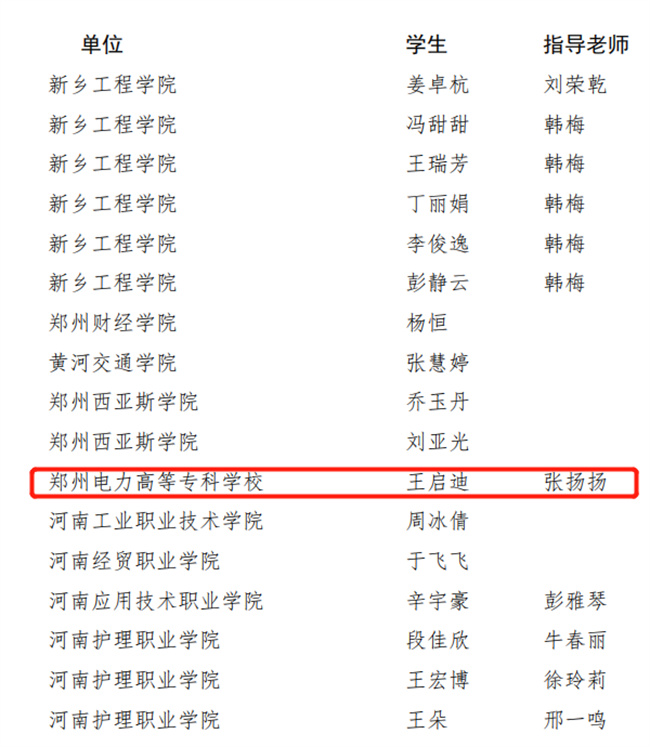 中新河南網(wǎng)10月23日電(王瑛潔) 近日,中共河南省委教育工委辦公室、河南省教育廳辦公室下發(fā)《關(guān)于公布“壯麗河山說”主題教育實踐活動獲獎結(jié)果的通知》,鄭州電力高等?茖W校榮獲“優(yōu)秀組織獎”,“先進個人獎”、“人氣之星獎”、“優(yōu)秀指導教師”各有1人獲得。