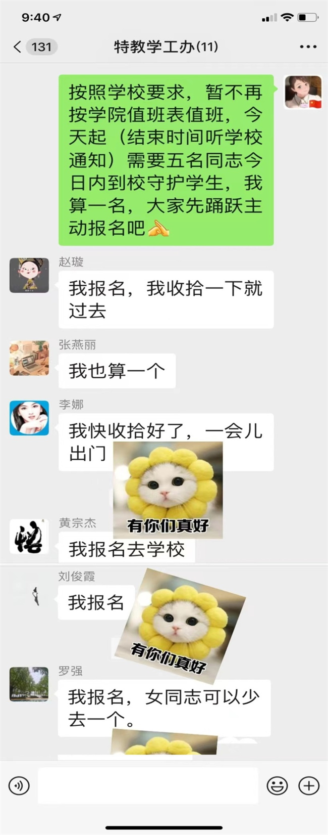 在疫情形勢嚴峻的背景之下,特殊教育學院在學院黨總支書記陳潔的帶領下,積極響應學校防疫號召,落實好各項疫情防控舉措,學院領導、學工隊伍入住校園,全方位做好學生服務、陪伴和心理疏導等工作,為學院學生保駕護航。