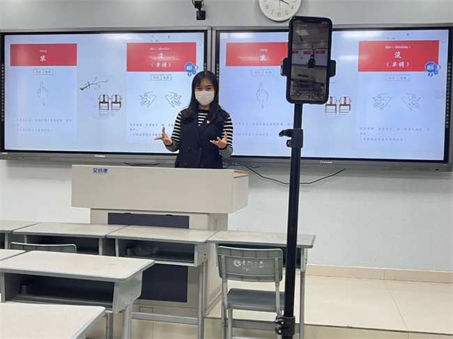 在校內值班的陳潔書記在教室直播課程提升上課有效性和趣味性