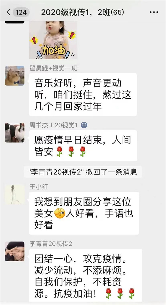 2021級視覺傳達設計1班吳雪同學表示,突如其來的疫情再次中斷了線下教學,但在上網課期間依然能夠感受到老師們飽滿的熱情。學院領導和輔導員老師深入學生群體中,時刻關心著我們的生活狀態(tài)和心理健康,并給我們提出了疫情期間的自我防護要求和建議。在教學上,老師們一心為學生著想,每節(jié)課都精心準備教學課件,還會給同學們推薦和學習有關的紀錄片。除此之外,能在宿舍里和聽人室友一起用手語交流,讓我感覺我們更像共同生活在溫馨小屋中的家人,大家一起努力共同進步。相信我們定會戰(zhàn)勝疫情,收獲成長!