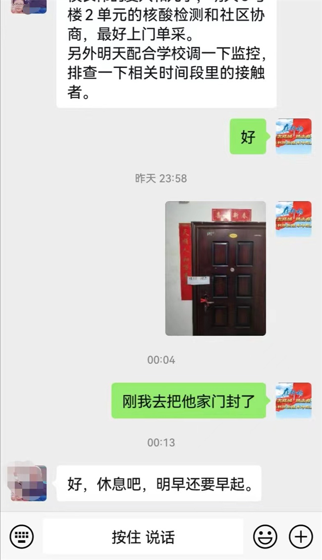 忙完這些,高老師回到辦公室,還沒來得及喘口氣,這時(shí)他的手機(jī)鈴聲就開始不斷響起。“高老師,我在網(wǎng)上訂的菜,您給看看送到大門口了嗎?”“高老師,我下午沒課,可以去當(dāng)志愿者,您給安排一下!”“高老師,家里老人的藥不能斷,如果送的藥到了,請(qǐng)您給安排送一下。”“高老師,家人今天出院回家,您幫忙給社區(qū)協(xié)調(diào)一下,咋回來呀?”……這樣的電話,他每天能接100多個(gè)。除了電話,他還得在微信群里及時(shí)發(fā)核酸檢測(cè)信息、防控要求,回復(fù)老師及家屬的各種問題。用他的話說:“一有空,我就得給手機(jī)充上電,身上帶塊充電寶,防止手機(jī)沒電了耽誤大家的事。大家都按要求足不出戶,我得努力做好這1200多戶的服務(wù)工作,盡全力保障大家的正常生活。”