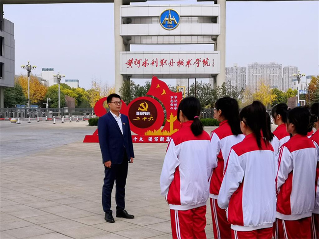 在室外校史館,他聲情并茂介紹了老校長王化云畢生致力于治理黃河,探索提出“寬河固堤”“除害興利,綜合利用”“蓄水?dāng)r沙”“上攔下排”等治河主張,為人民治黃事業(yè)作出重大貢獻(xiàn)、培養(yǎng)大批建設(shè)人才的輝煌成就。他講到,學(xué)校培養(yǎng)的賀樹明、謝會貴等一大批治水英才,長期扎根黃河一線,為大河安瀾譜寫了精彩華章,也為同學(xué)們樹立了榜樣。胡昊叮囑同學(xué)們,要肩負(fù)使命,苦練本領(lǐng),立志成為護(hù)佑黃河安瀾的能工巧匠、大國工匠。(黃河水利職業(yè)技術(shù)學(xué)院供稿)